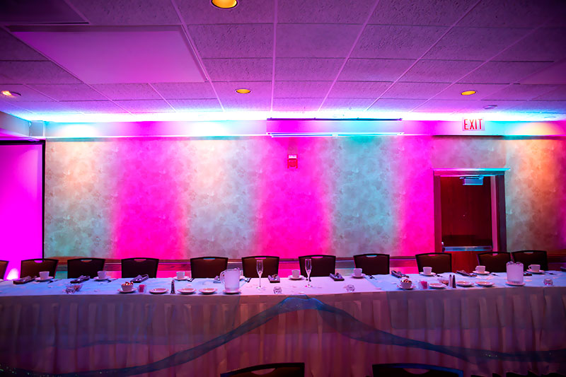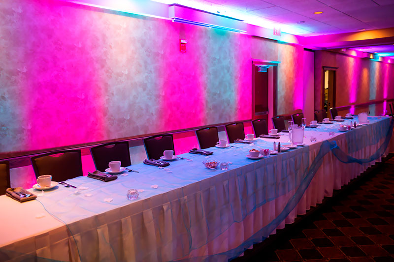 You have found the perfect venue but want to incorporate your color scheme into the reception design. You can use lighting to accent the architectural features of your venue or camouflage parts of the room you are not as fond of. Up lighting can add subtle color to the room to accent your floral design.